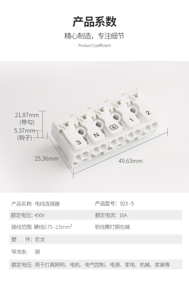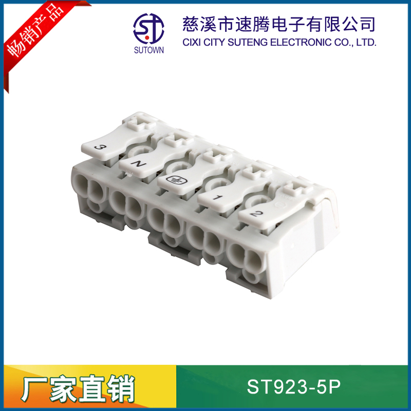 Product name:923 terminal block 5P Product model:ST923-5P Apply to wire:Hard and soft conductor 0.75-2.5mm^2 Technical parameter:Rated voltage:400V Rated current:24A Product size:50*,25*,21mm(Depth,width,hight) Product materials:Crust:Modifled nylonPA66 The diversion of article:Electrolysis copper (surface of the tin) Spring:301 Stainless steel