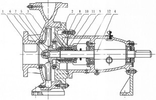 IS、IR型泵系根據國家標準ISO2858所規定的性能和尺寸設計的,主要由泵體(1)、泵蓋(2)、葉輪(3)、軸(4)、密封環(5)、軸套及懸架軸承部件(12)等所組成。